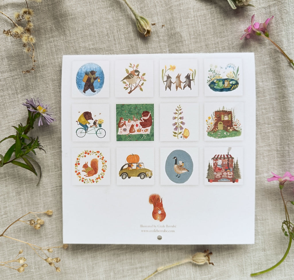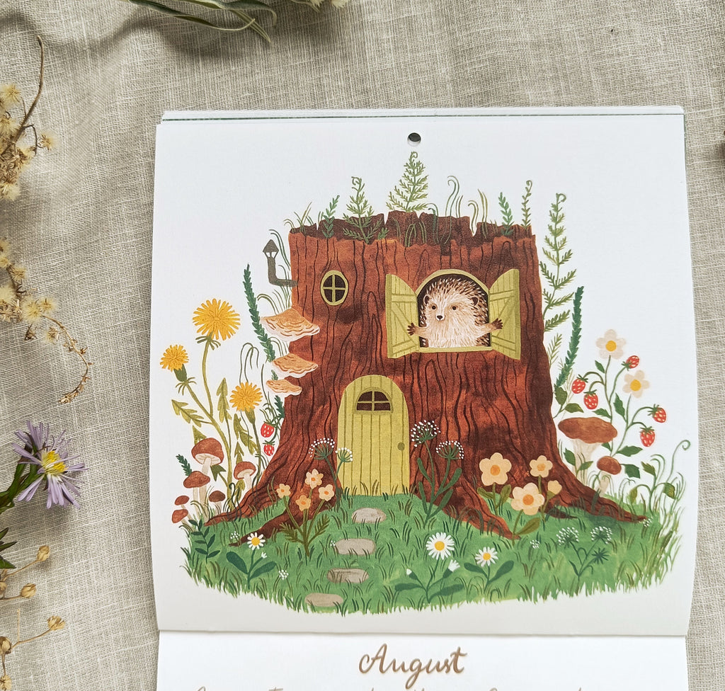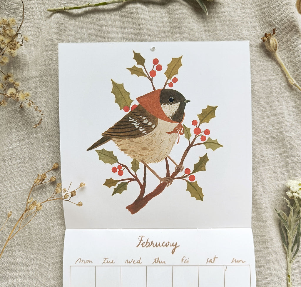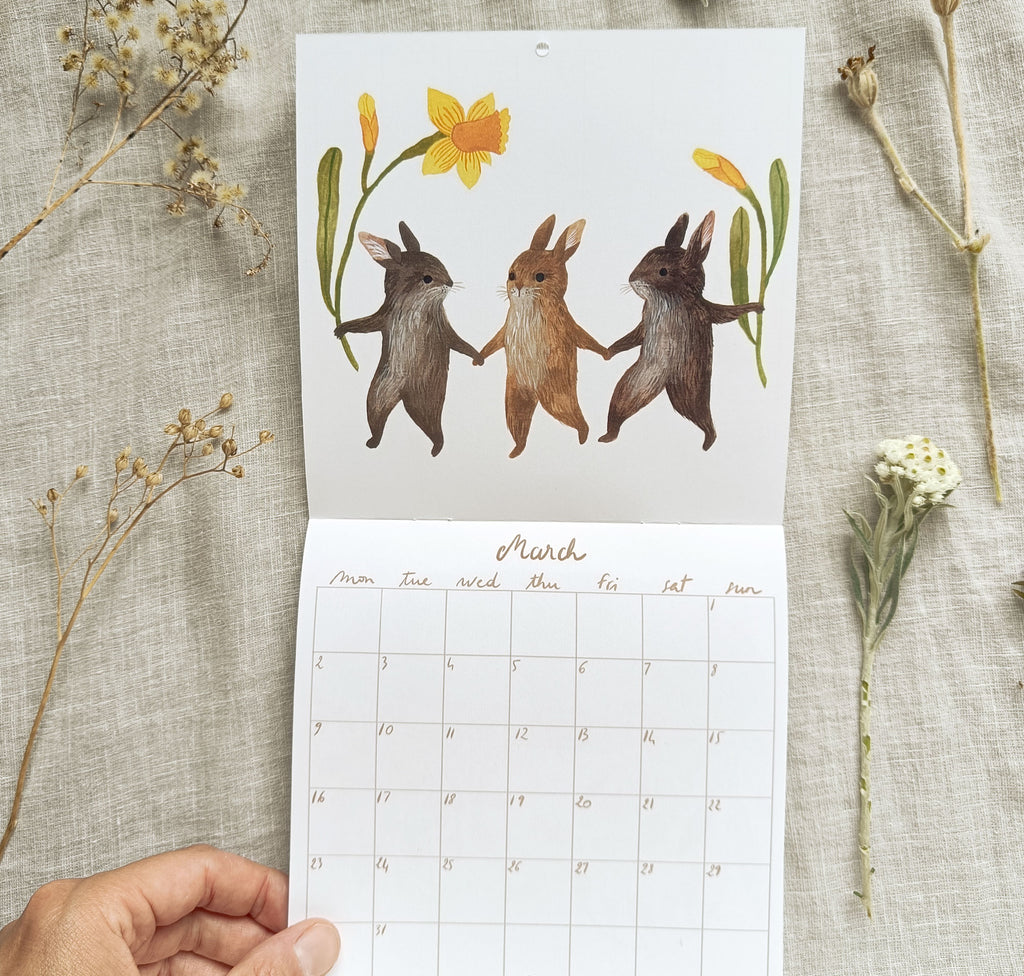 Each page has an illustration and a date grid (Monday to Sunday) with space to write your appointments and save your favourite dates.